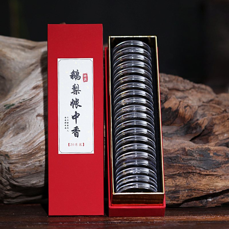 E Li Zhang Zhong Xiang Incense Chips: 20 ready-made incense seals come in a set. Each has independent acrylic round packaging and black fireproof cotton.